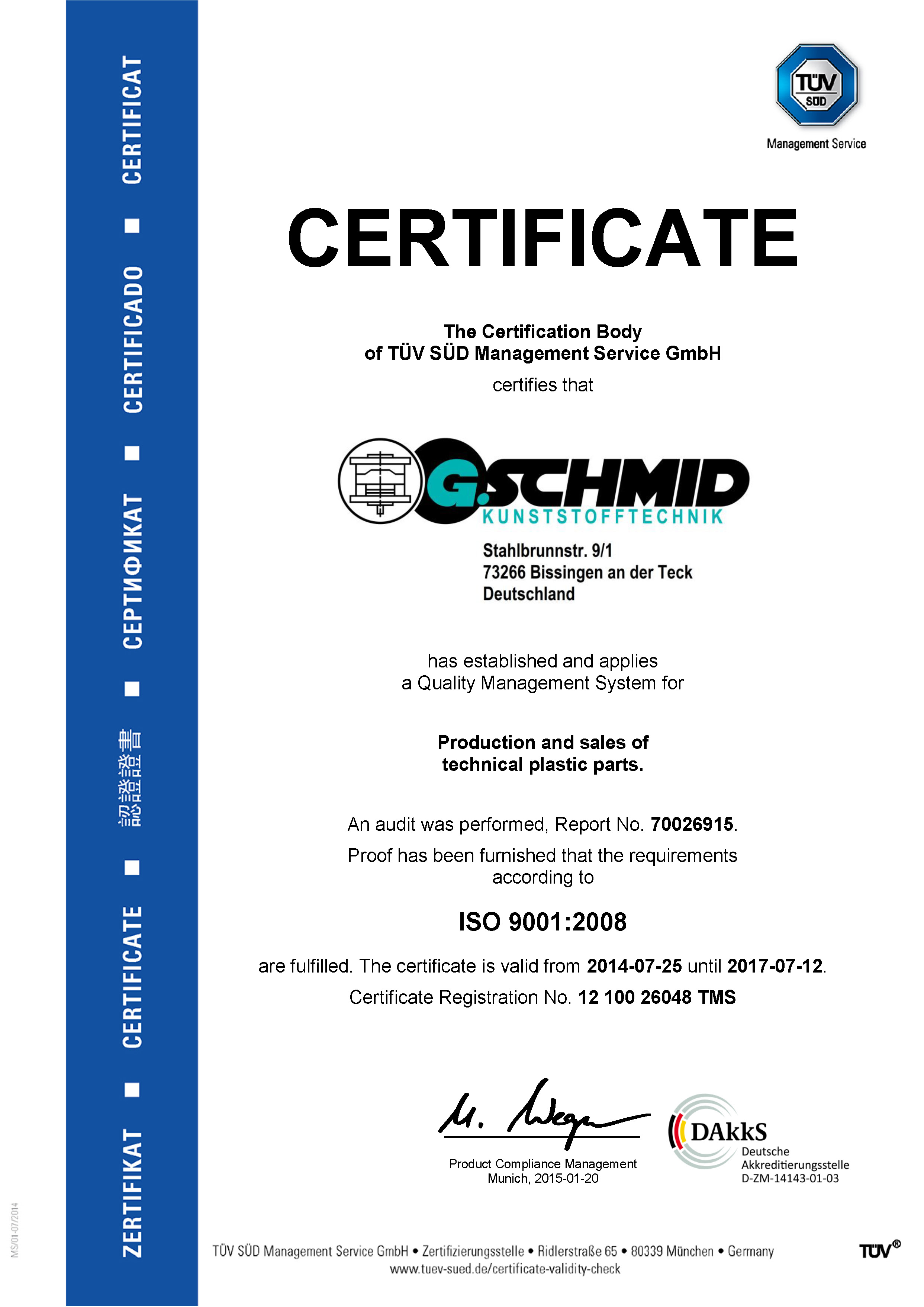The ISO 9001 demands not only the implementation of a Quality Management System to fulfil the requirements of the norm, but also, above all, that it is a strategic decision by the company management that is realised and lived in the company. Our company has now been certified according to quality management norm ISO 9001:2015 and environmental management norm 14001:2015 for many years and also audited according to VDA 6.3.